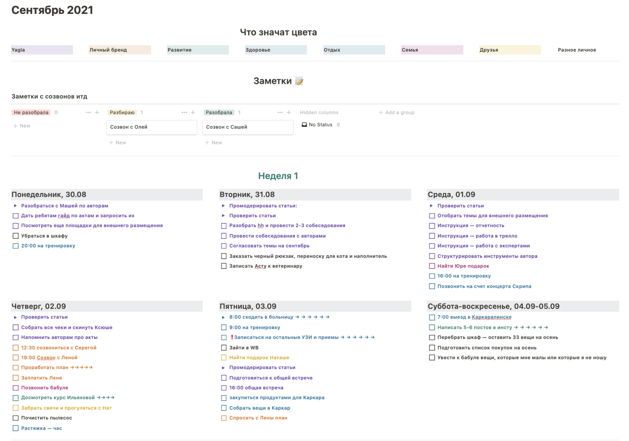 Наш главред подбила свой личный планировщик под шаблон электронного ежедневника в Notion. Его может использовать любой, кто хочет серьезно подойти к вопросу системы тайм-менеджмента. Варианта два — просто забрать и использовать или же прочитать как он создавался и какие задачи решает, а затем придумать собственное решение.