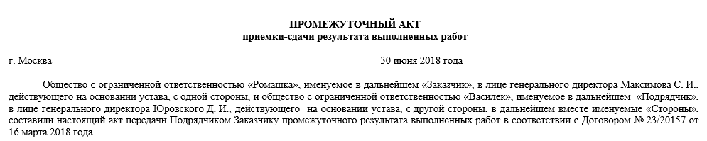 Если в договоре указан большой объем работ, для удобства составляют промежуточный акт выполненных работ. Образец можно скачать ниже. В документе можно, например, определить, в какой срок надо завершить различные этапы работ, а также их стоимость и условия выплаты неустоек.