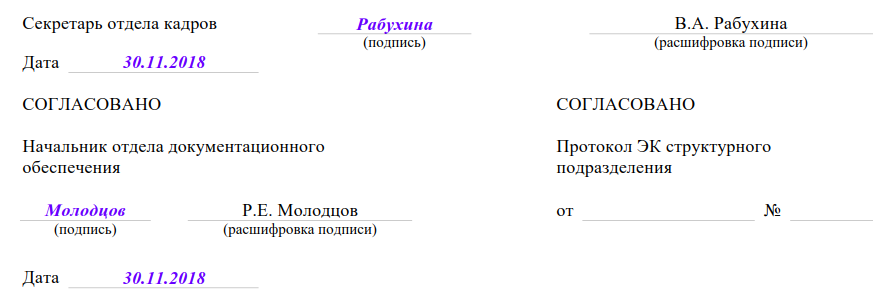 Обратите внимание, что поле для согласования экспертной комиссией в данном случае осталось пустым. Это потому, что в данном подразделении нет экспертной комиссии