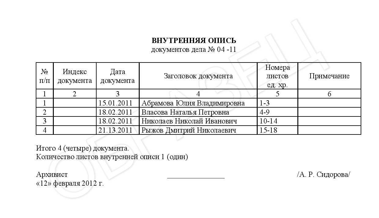 Такая опись составляется работником, ответственным за ведение личных дел. Храниться она вместе с личными делами. Оформляется при поступлении в компанию нового дела. Включает в себя эти сведения: