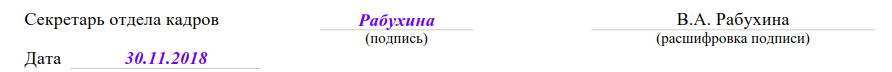 - Далее следует подпись ответственного за передачу лица, а также отметка о принятии документов с указанием ФИО, должности принявшего сотрудника и даты принятия.