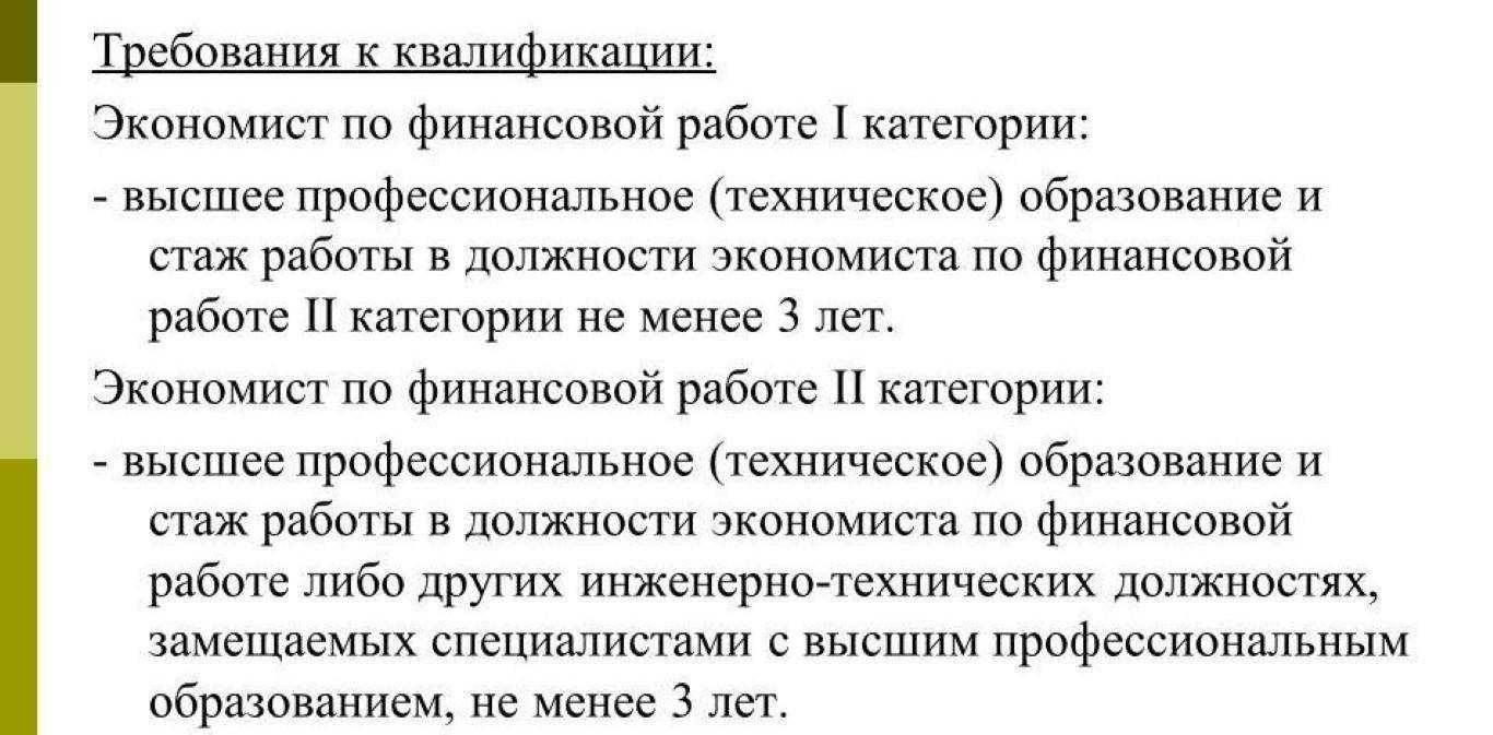 И так далее. Для экономистов выделяется несколько категорий – ведущая, первая и вторая. Вторую категорию не получить без профильного высшего образования. И практического опыта работы в сфере на протяжении минимум трёх лет. Для первой категории практического опыта будет достаточно.