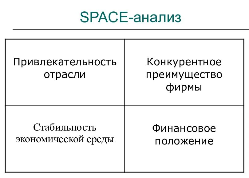 Название метода SPACE расшифровывается как Strategic Position and Action Evaluation, в переводе на русский – «оценка стратегического положения и действия».