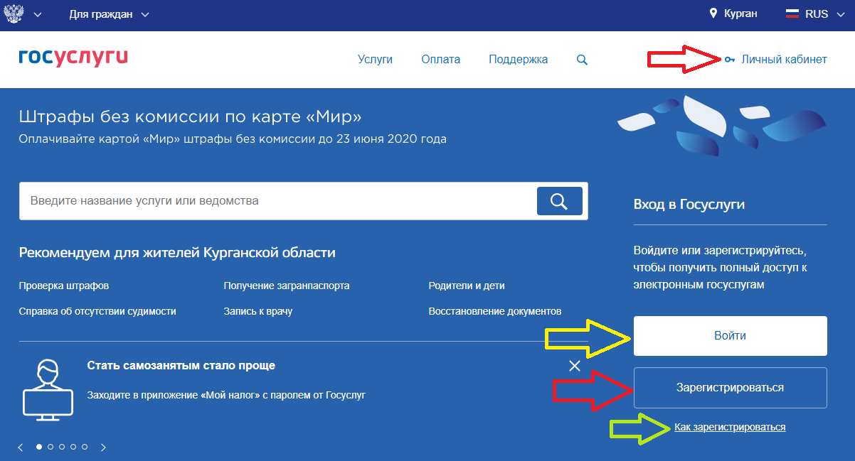 Если вы не зарегистрированы, то сначала надо зарегистрироваться. Если уже зарегистрированы, то просто войдите в личный кабинет (щёлкните по кнопке ВОЙТИ или ссылке “Личный кабинет”, см. рис.):