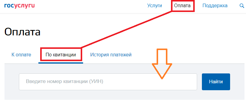 Затем надо ввести УИН (Уникальный идентификатор начислений по платежам за государственные и муниципальные услуги) и нажать кнопку НАЙТИ.