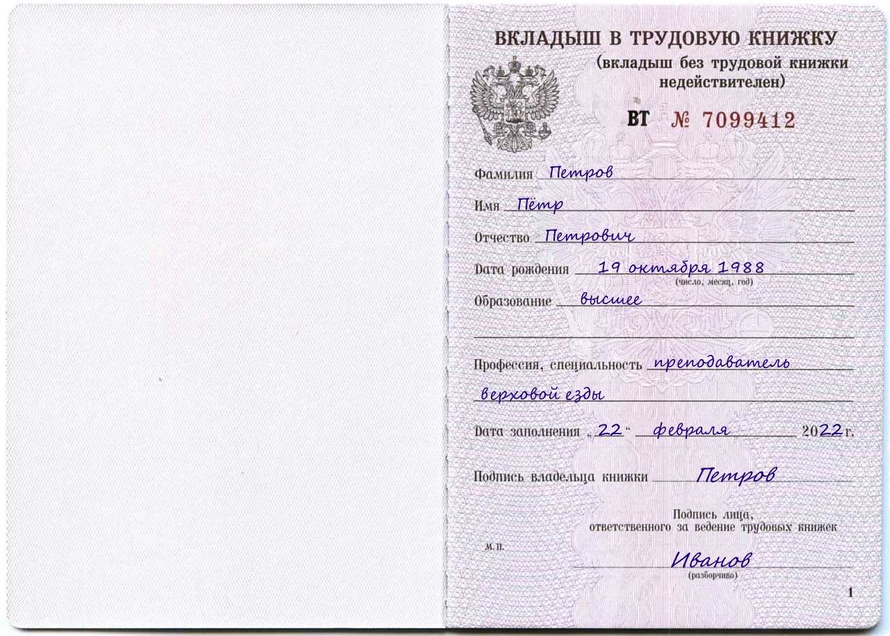 Оформление вкладыша в трудовую книжку (образец)