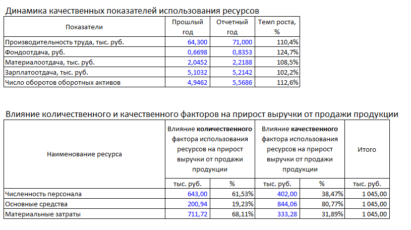 - Определяем динамику показателей, характеризующих качественное и количественное использование ресурсов. Для расчета используем показатели отчетного и предшествующего периодов.