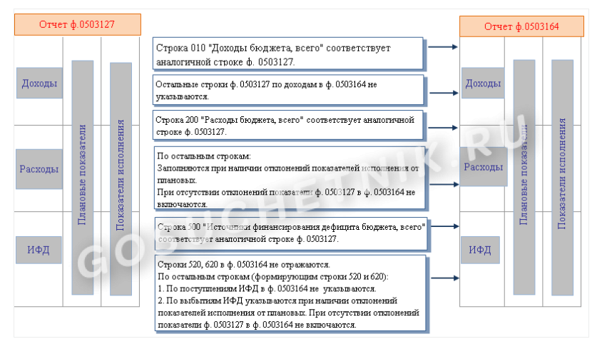 Формуляры 0503164 и 0503127 напрямую связаны между собой. Отразим эту взаимосвязь бухотчетности в виде схемы:
