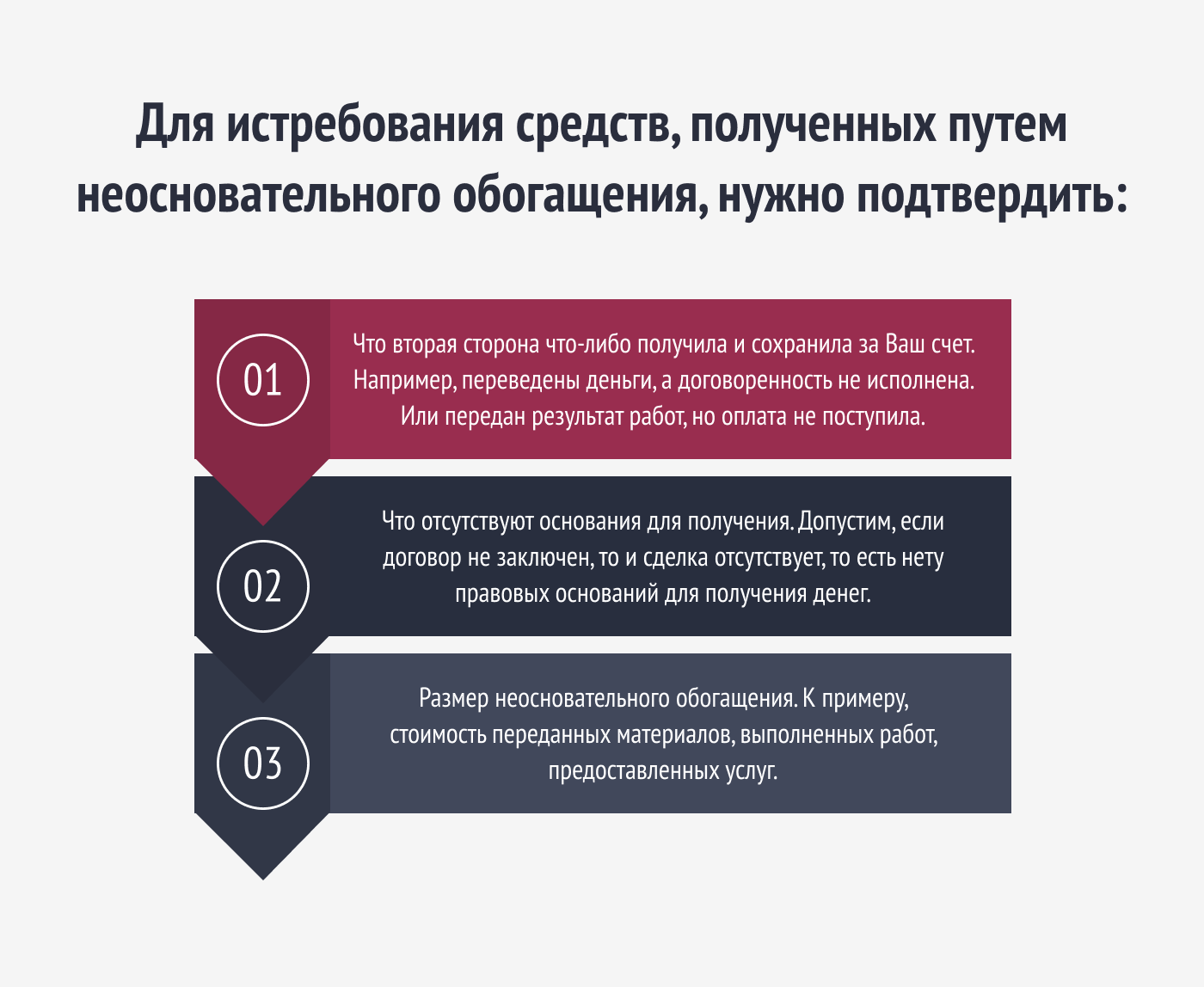 Напоследок осталось рассмотреть ситуацию с возвратом неосновательного обогащения. Для истребования средств нужно подтвердить: