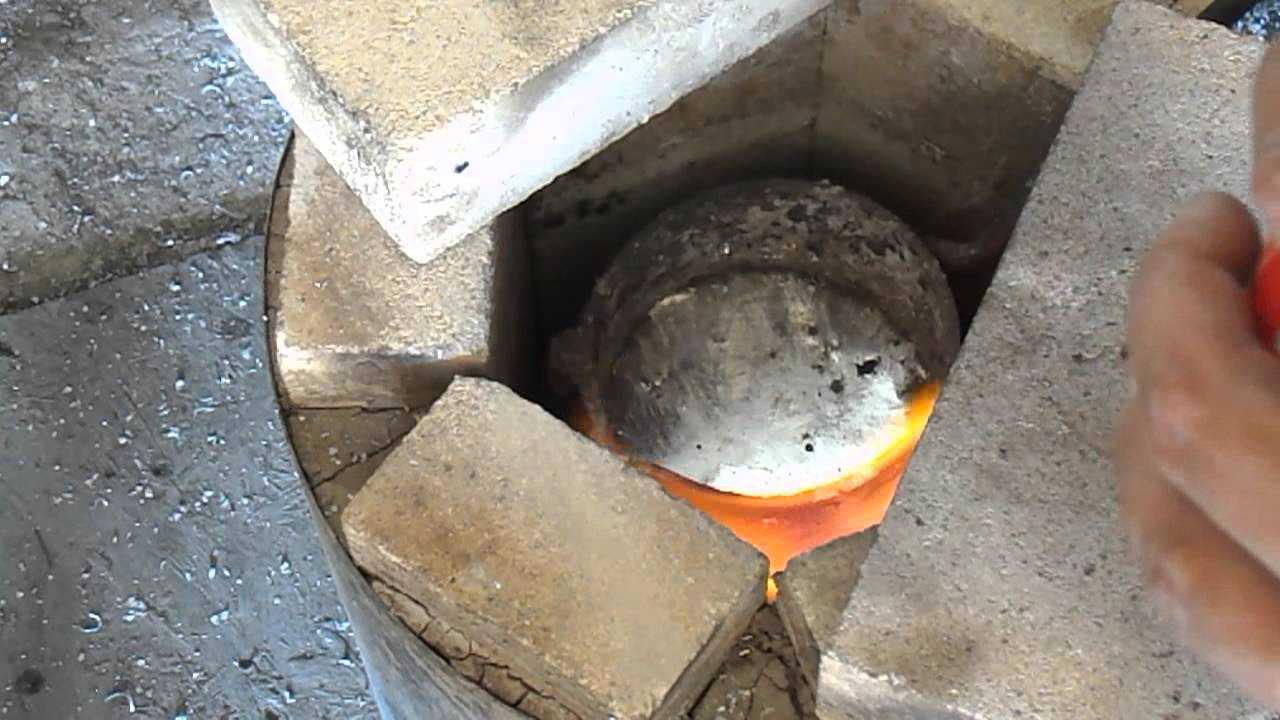 Из кирпичей сооружается очаг, каркас изготавливается из металлической емкости. Сбоку сверлится отверстие для подачи кислорода. К металлической трубке присоединяется пылесос, фен или другой прибор, нагнетающий воздух. После разведения огня тигель помещают в очаг.
