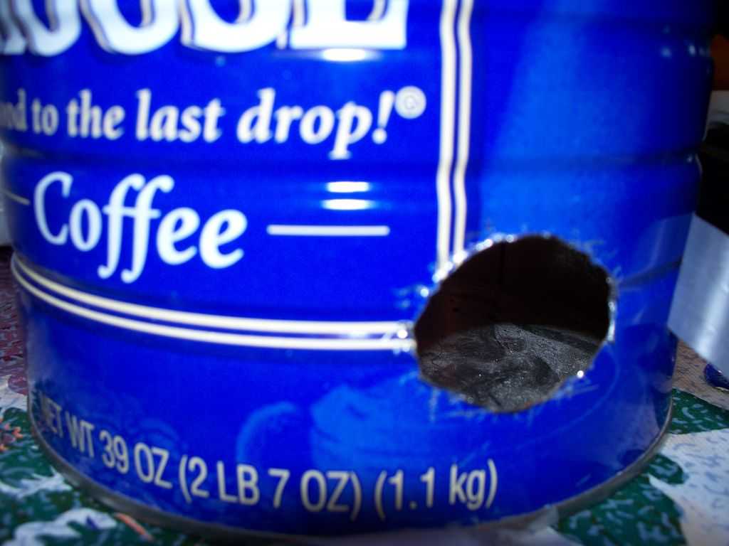 - Используя нож, вырежьте отверстие в нижней части маленькой кофейной банки в форме мышиной норы (убедитесь, что труба туда входит).