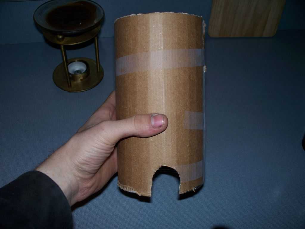 - Оберните маленькую банку в картон (это делается, чтобы её проще было достать) и вырежьте такое же отверстие в картоне в форме мышиной норы.