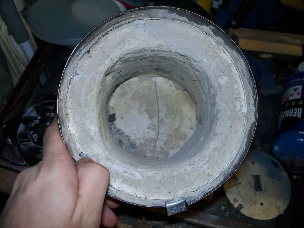 - Вам необходим тигель для плавки. Представляет собой сосуд из тугоплавкого материала с носиком. Собственно в нем и плавится алюминий. Изготовлен тигель может быть из чугунного, стального или графитового материала. Можно изготовить тигель в домашних условиях из стальной трубы, но это трудоемкий процесс для тех, кто умеет работать с болгаркой, паяльной лампой и т.д.;