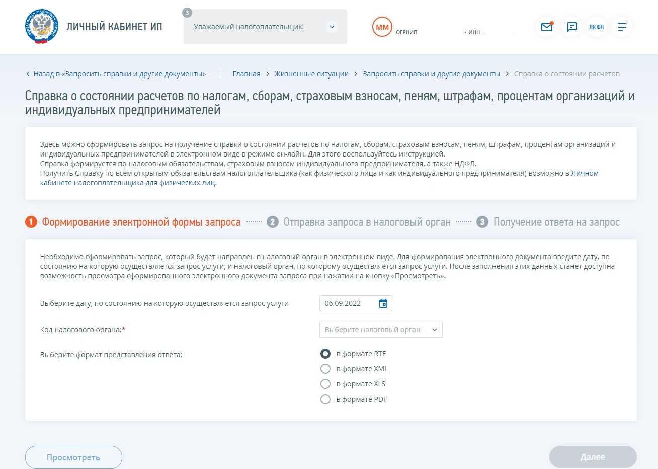 При таком варианте требуется ввести только дату запроса, на которую необходимо получить сведения, код налогового органа, который администрирует налог, и формат, в котором вы планируете получить документ.