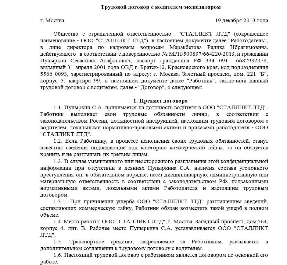 Трудовой договор с водителем-экспедитором